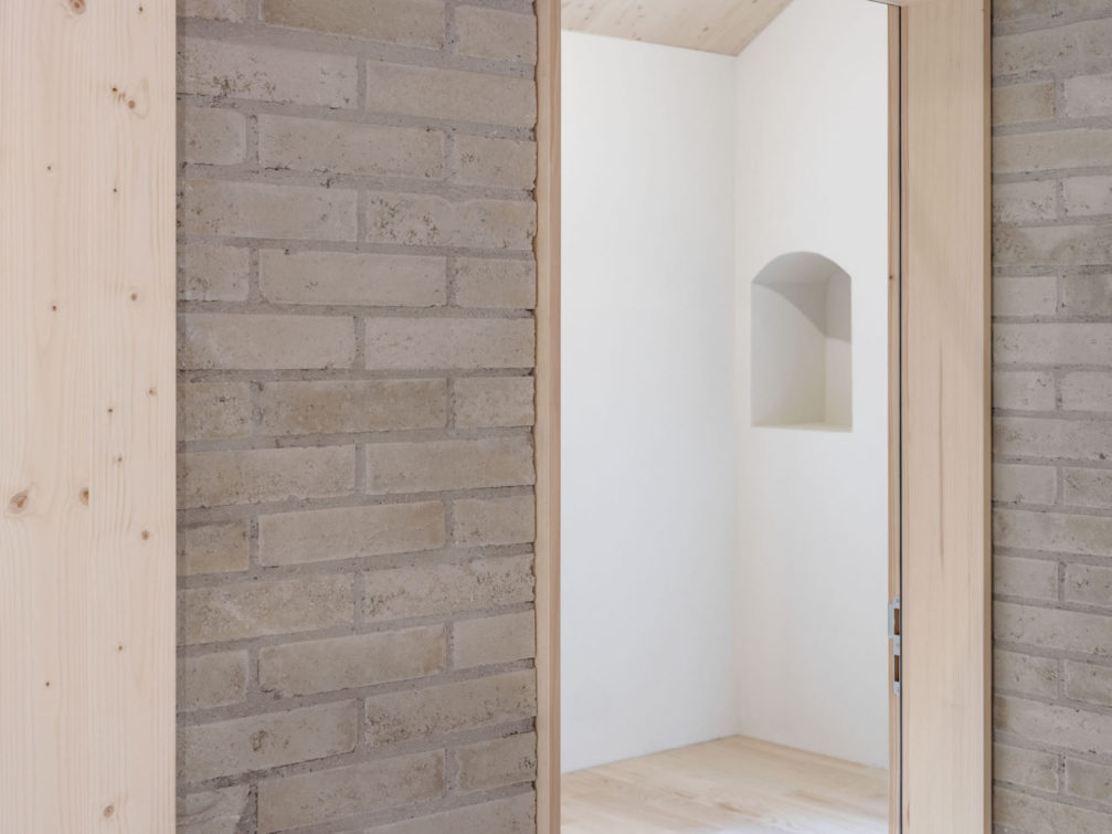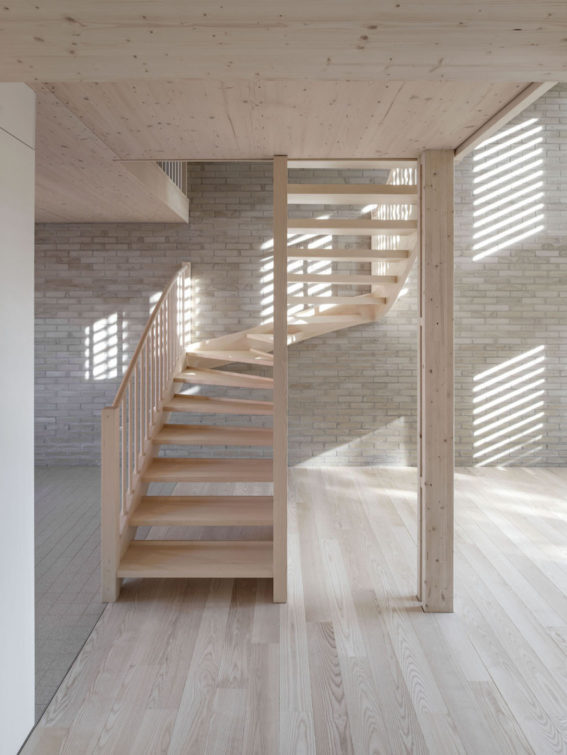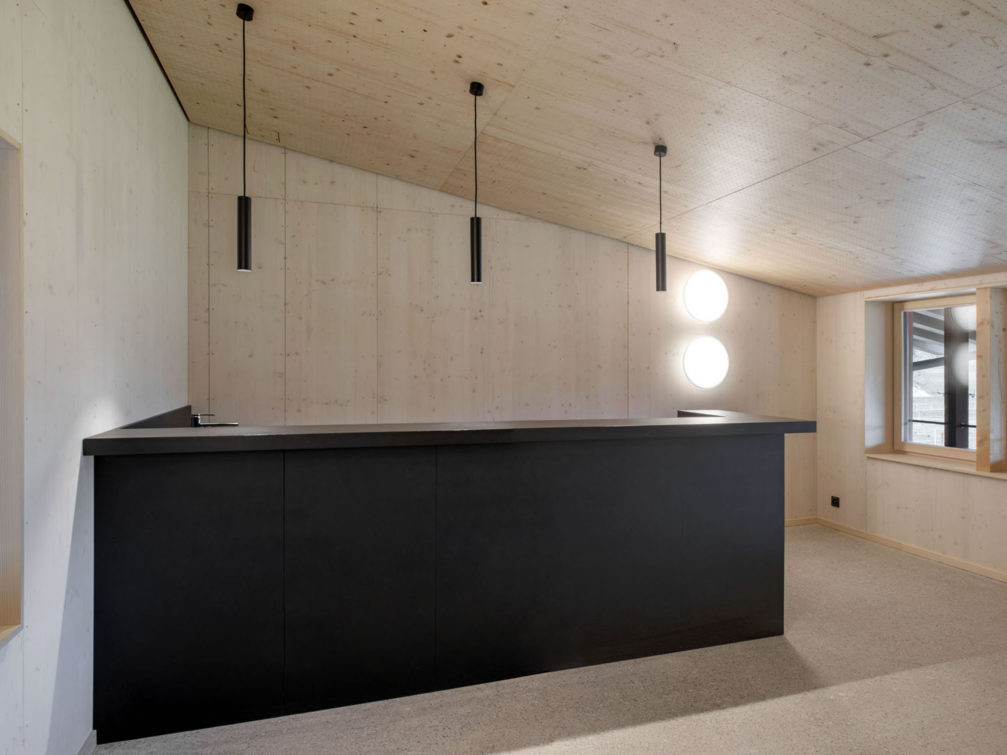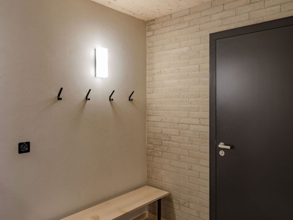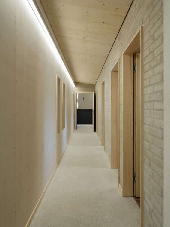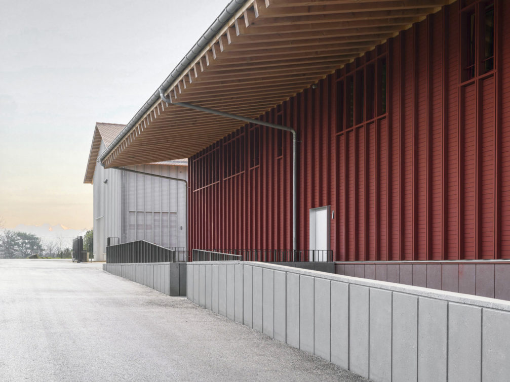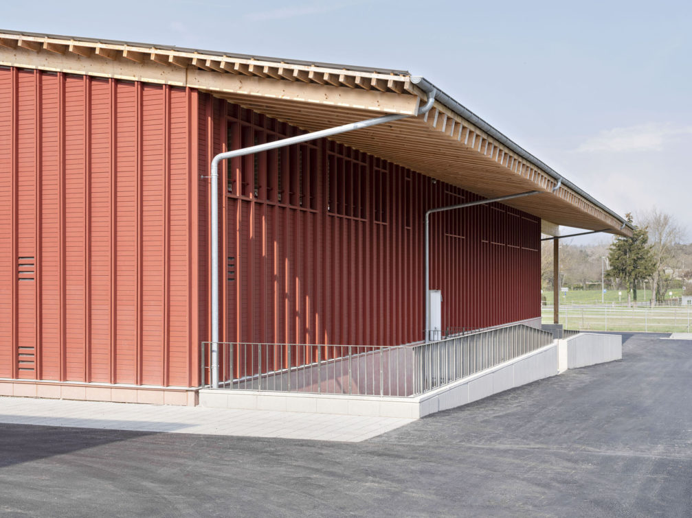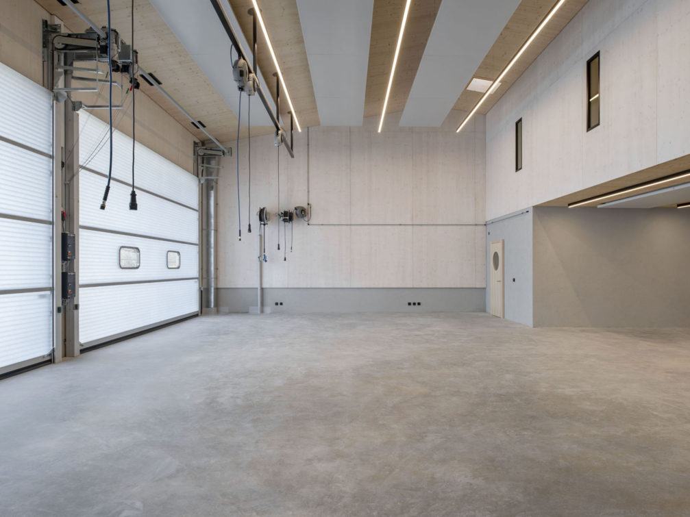 Lui faisant face et adoptant le même langage architectural mais dans un volume plus bas, deux grandes halles bardées de sapin rouge sont organisées de manière à tirer parti de leur implantation. Côté route de Mon-Idée, les ateliers s’ouvrent largement sur la cour, et facilitent les allées et venues des véhicules. A l’étage, les locaux de formation et les bureaux de l’état-major sont tournés vers les champs voisins et profitent d’un paysage calme et bucolique. Les constructions ont été pensées pour répondre à des problématiques de durabilité. Les structures sont en bois massif, les galandages en briques de terre compressée, les isolants ont été choisis biosourcés, et tous les traitements de finition ont été étudiés pour garantir une qualité d’air intérieure irréprochable.